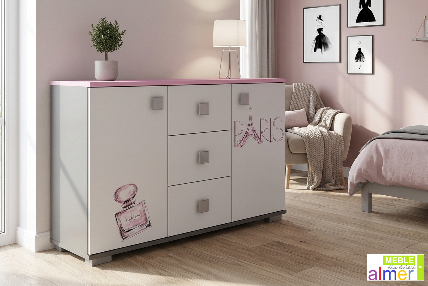 Szukasz mebla, który jest nie tylko pojemny, ale też stanowi efektowną dekorację wnętrza? Komoda młodzieżowa PARIS Y42 to idealne rozwiązanie do pokoju nastolatki, sypialni lub przedpokoju. Dzięki przemyślanemu układowi – trzem szufladom oraz bocznym szafkom z półkami – z łatwością zapanujesz nad chaosem w rzeczach osobistych.