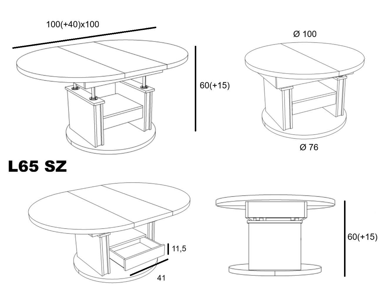 Ławostół L65 Okrągły Kalwados Szuflada 100(+40) w.60(+15) Podnoszona Rozkładana Ława Stolik