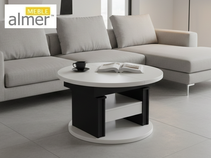 Ławostół L65 Okrągły Biały Czarny Szuflada 100(+40) w.60(+15) Podnoszona Rozkładana Ława Stolik