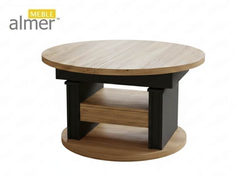 Ławostół L65 Okrągły Atelier Jasny Czarny Szuflada 100(+40) w.60(+15) Podnoszona Rozkładana Ława Stolik