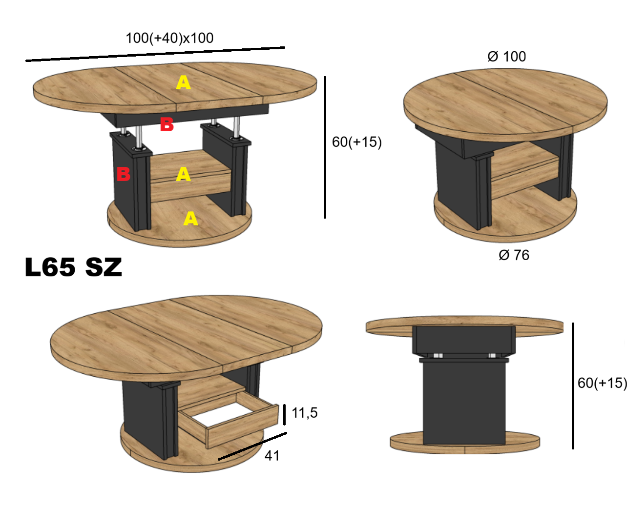 Ławostół L65 Okrągły Kalwados Szuflada 100(+40) w.60(+15) Podnoszona Rozkładana Ława Stolik