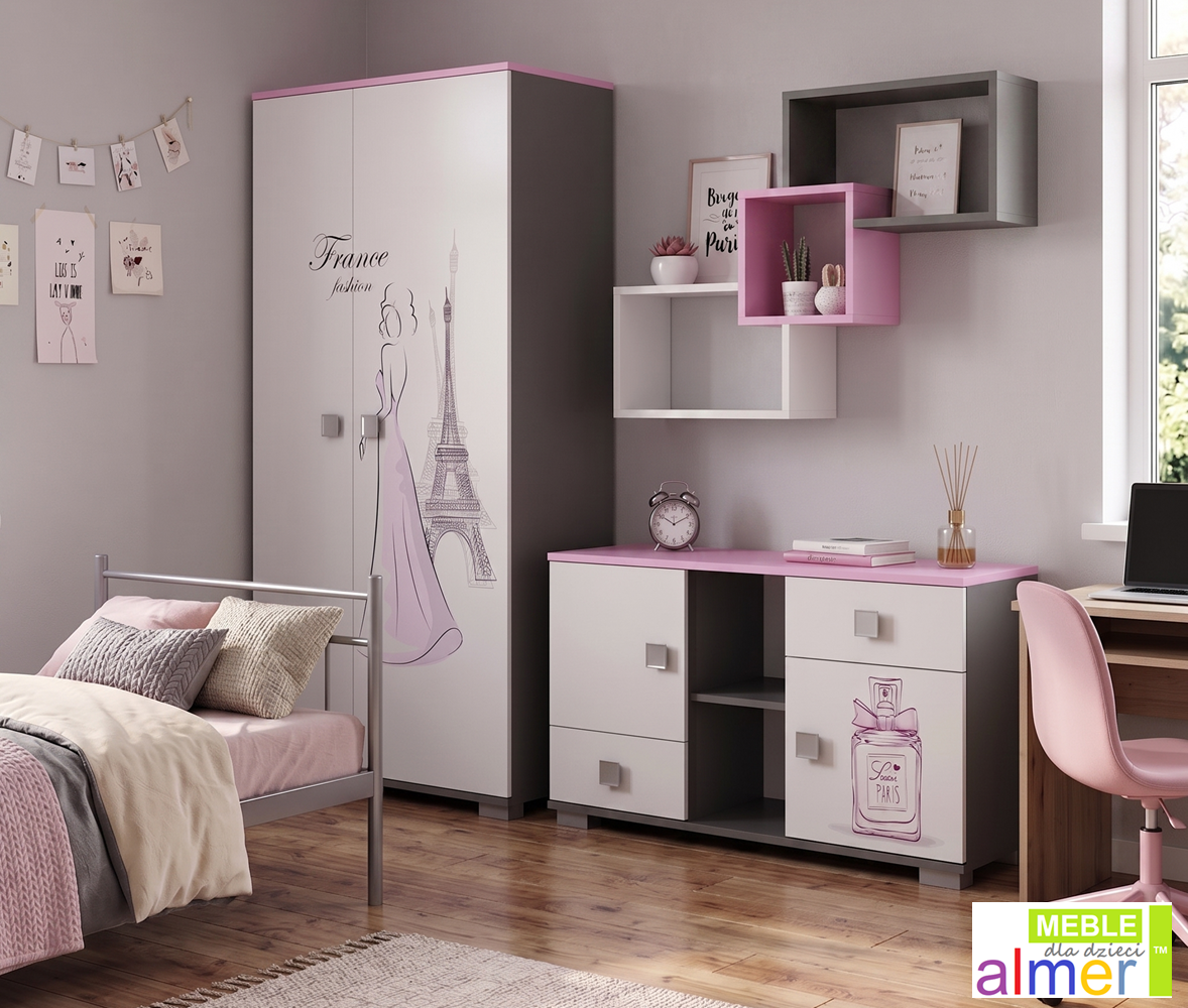 Półka PARIS YP2 jest częścią szerokiej kolekcji mebli młodzieżowych od ALMER MEBLE. Możesz ją dowolnie zestawiać z biurkami, szafami czy łóżkami z tej samej serii, tworząc spójną i funkcjonalną przestrzeń dla swojej córki. Motyw nawiązujący do Paryża i modna kolorystyka sprawią, że pokój nabierze wyjątkowego charakteru.